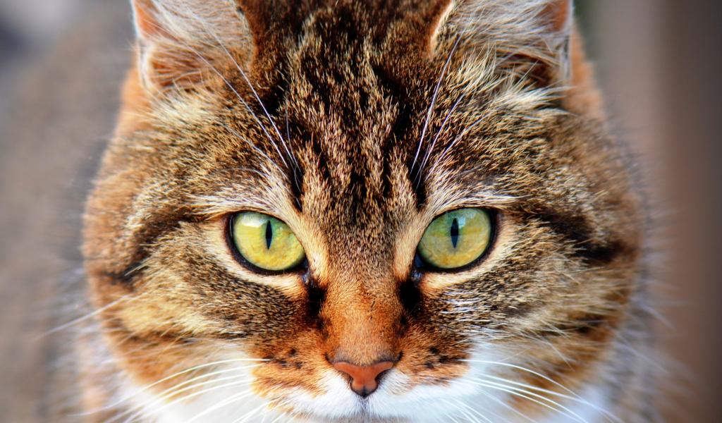 Wallpaper Muzzle of a gray tabby cat with green eyes