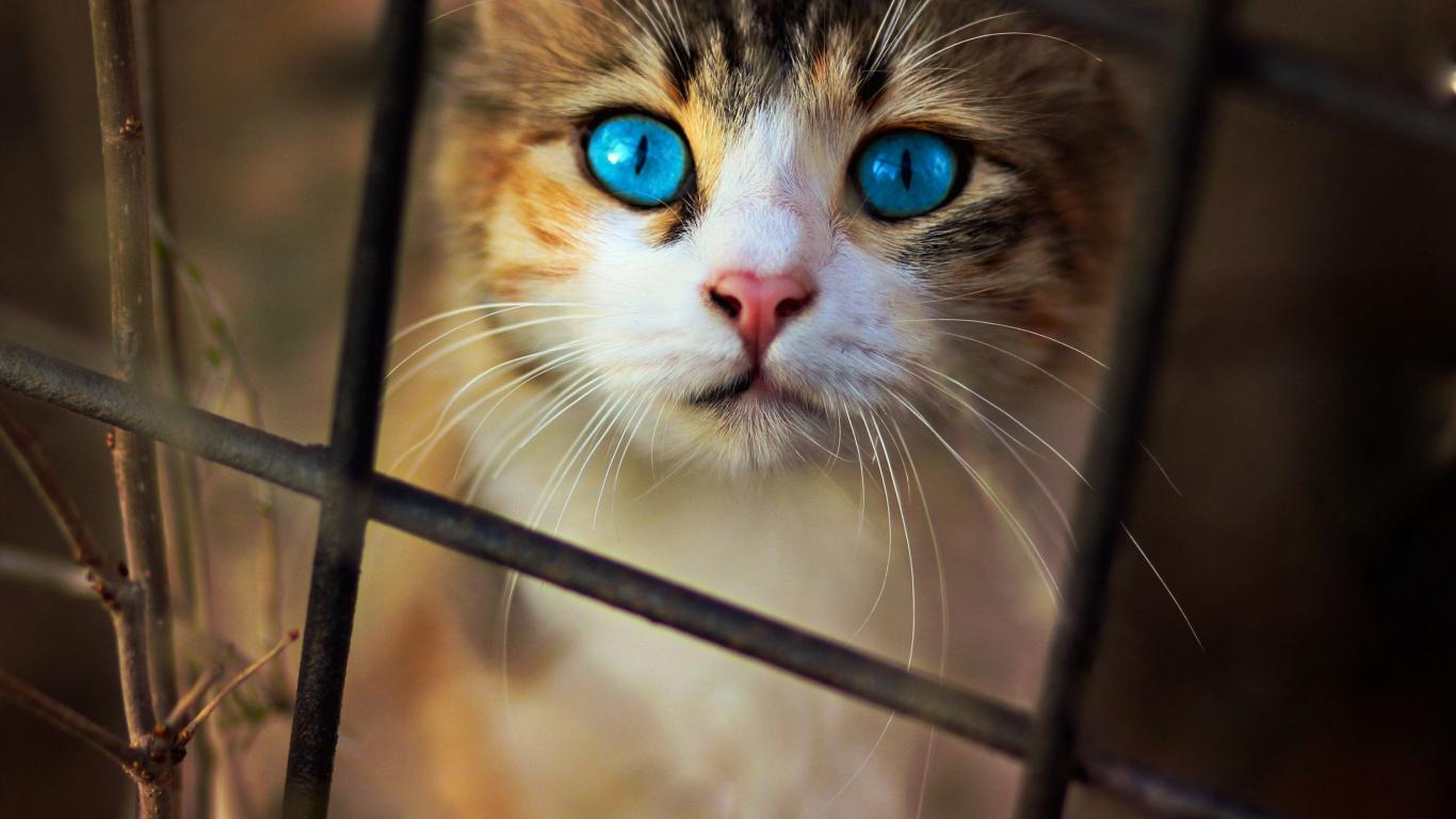 » Wallpaper Beautiful blue-eyed cat looking through the grille