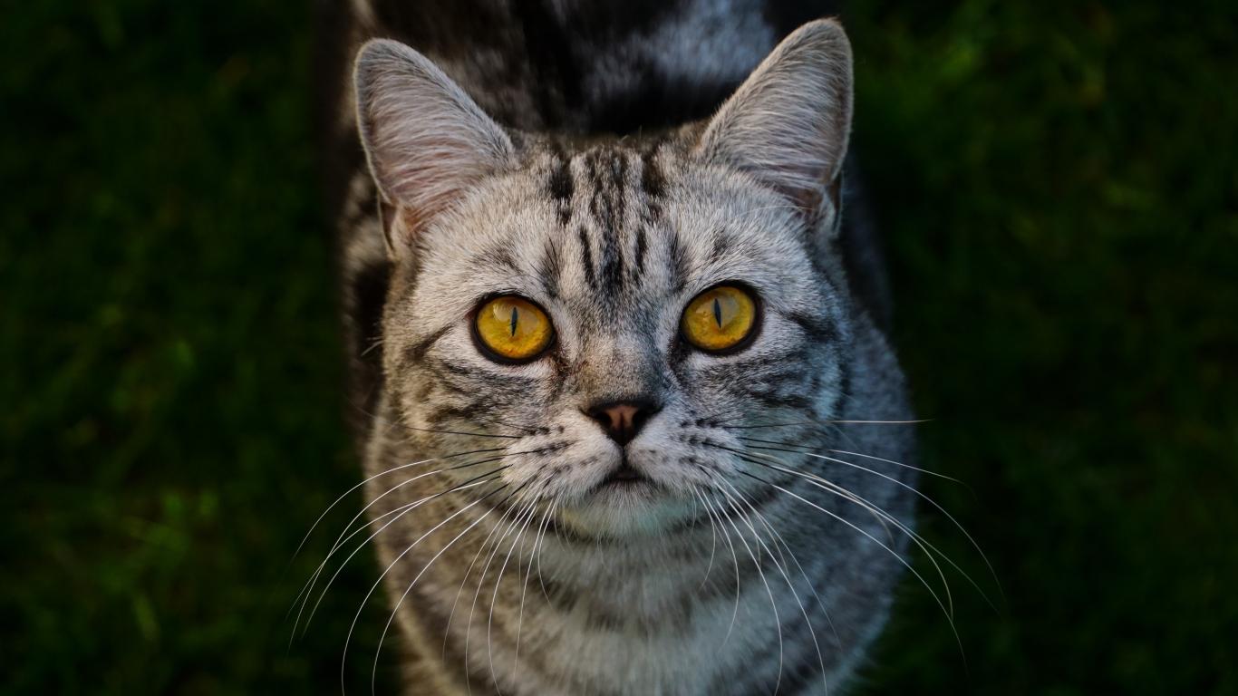 Wallpaper Pure gray cat with yellow eyes on green grass