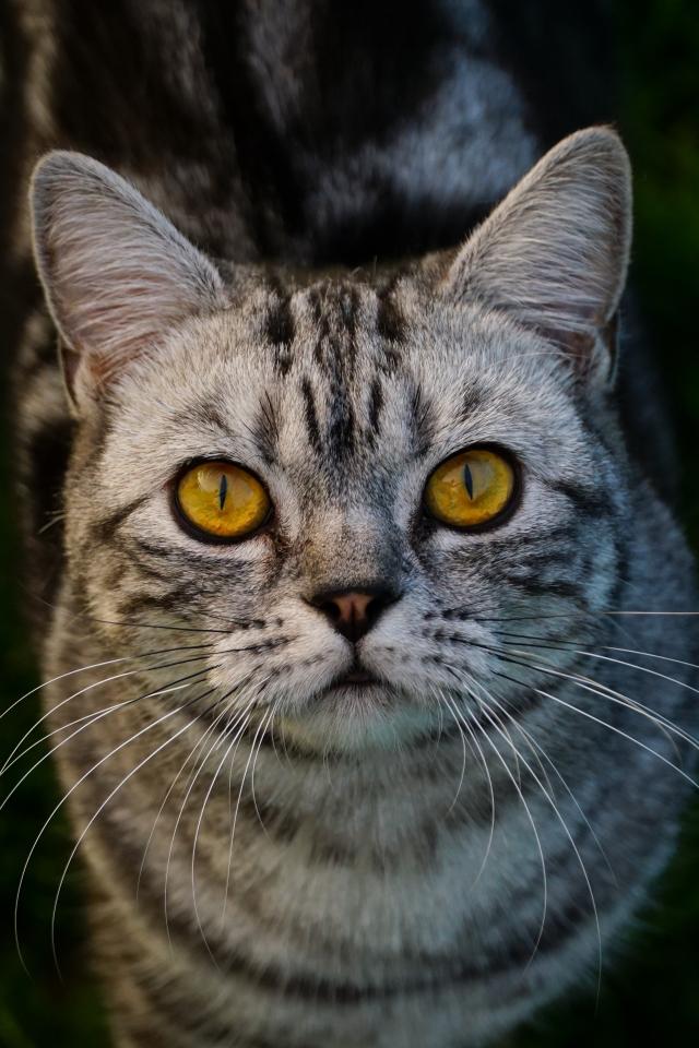 Wallpaper Pure gray cat with yellow eyes on green grass