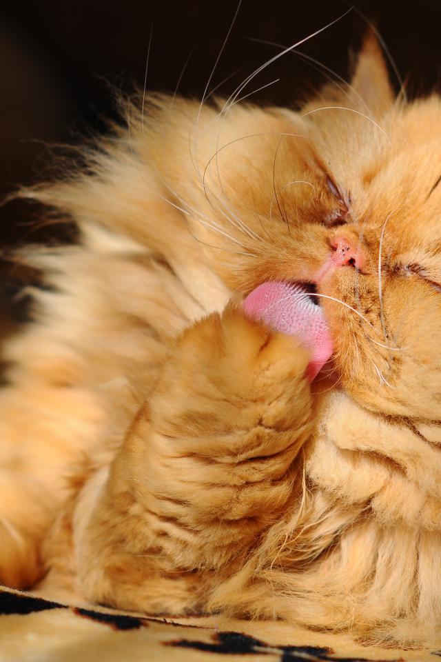 Wallpaper Fluffy red Persian cat licks paw