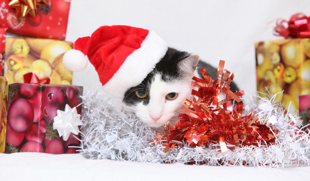 Wallpaper Black and white cat in a Christmas hat with gifts