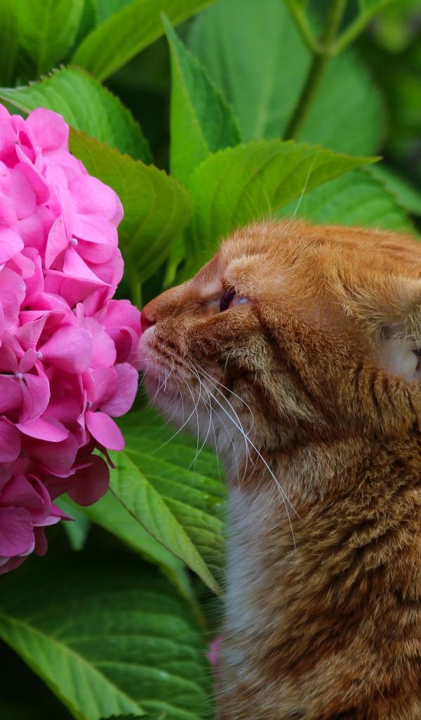 Wallpaper Ginger cat sniffs pink hydrangea flower