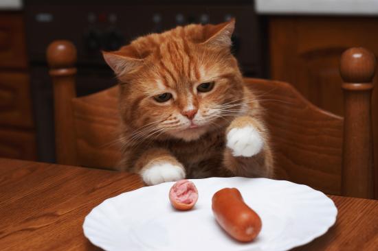 Wallpaper Ginger cat steals sausage from the plate on the table