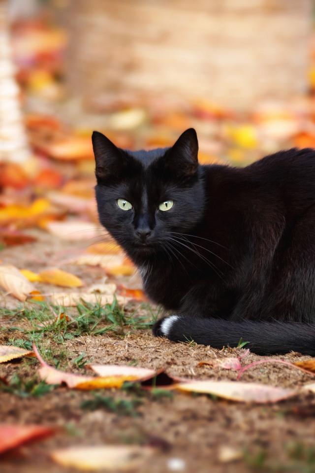 Wallpaper Black cat sitting on the ground with fallen yellow leaves
