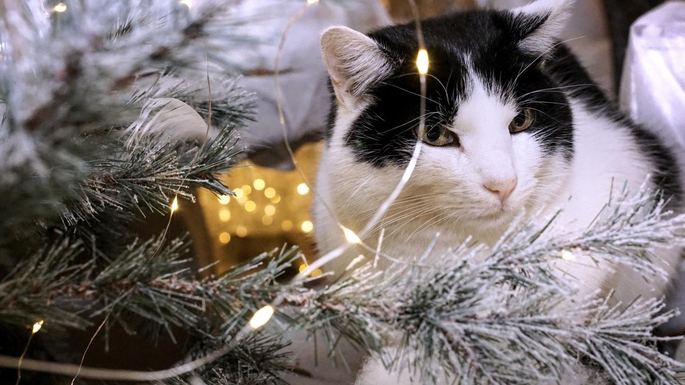 Wallpaper Beautiful cat sitting by the Christmas tree with a garland