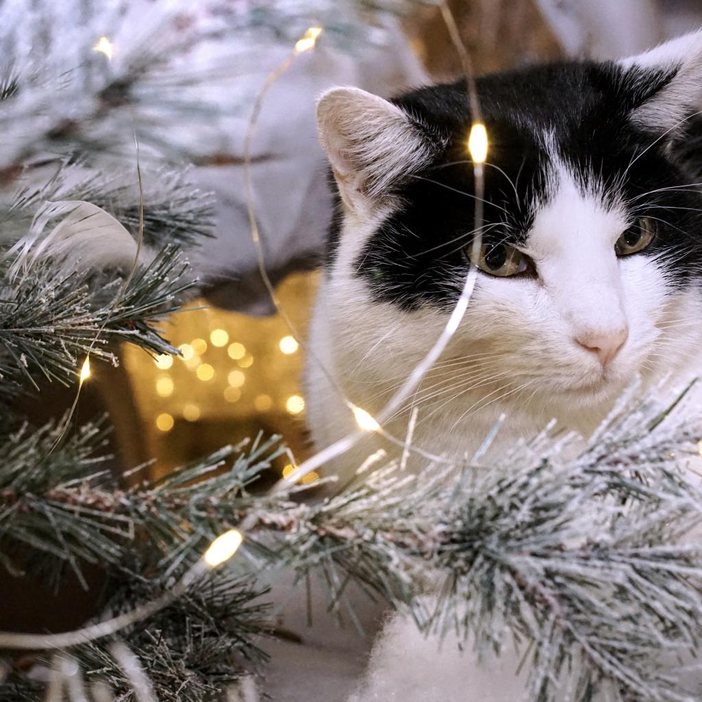 Wallpaper Beautiful cat sitting by the Christmas tree with a garland