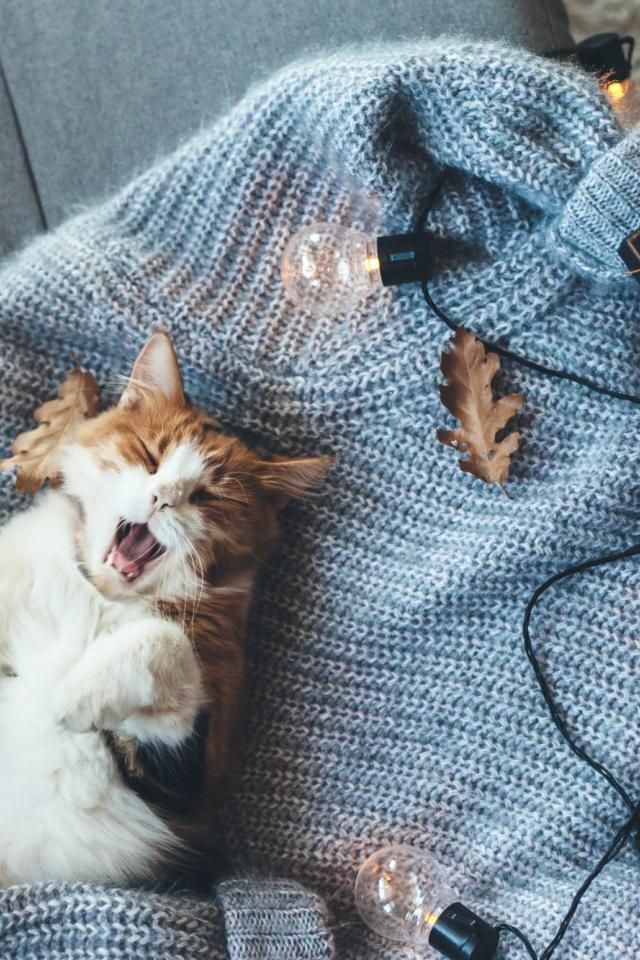 Wallpaper Yawning red and white cat lying on a sweater with light bulbs