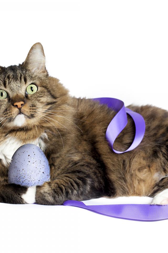 Wallpaper Gray fluffy cat with Easter eggs on a white background