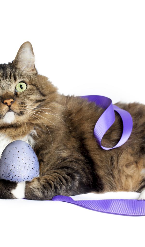 Wallpaper Gray fluffy cat with Easter eggs on a white background