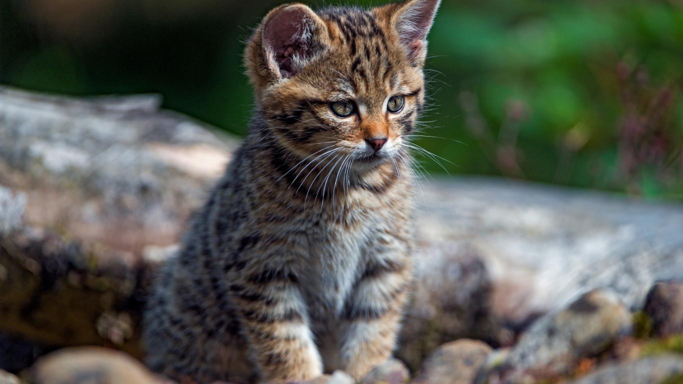 Wallpaper Little curious gray kitten on a dry tree.