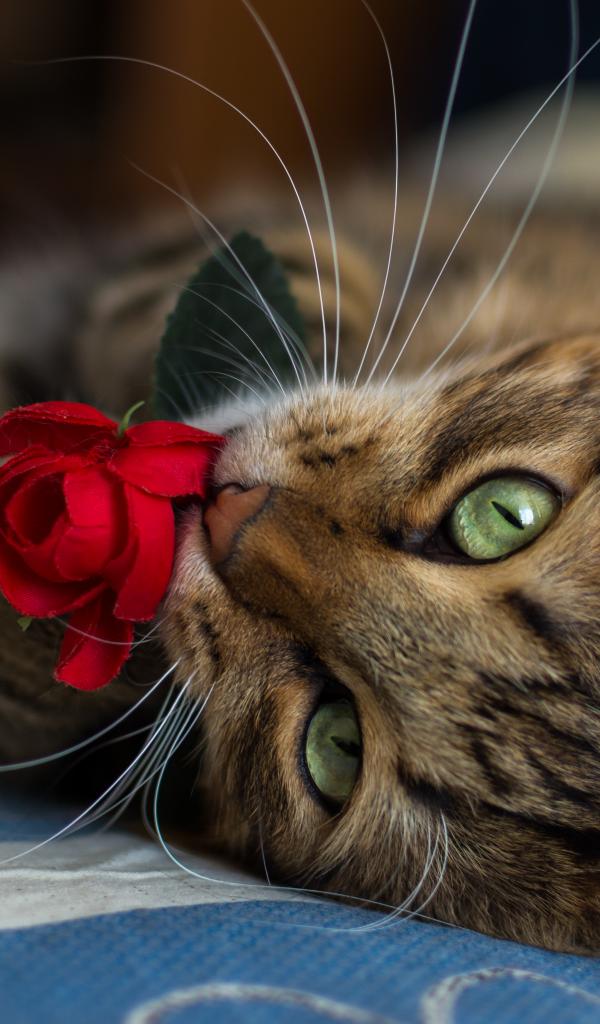 Wallpaper Gray cat lying on the bed with a rose in his teeth