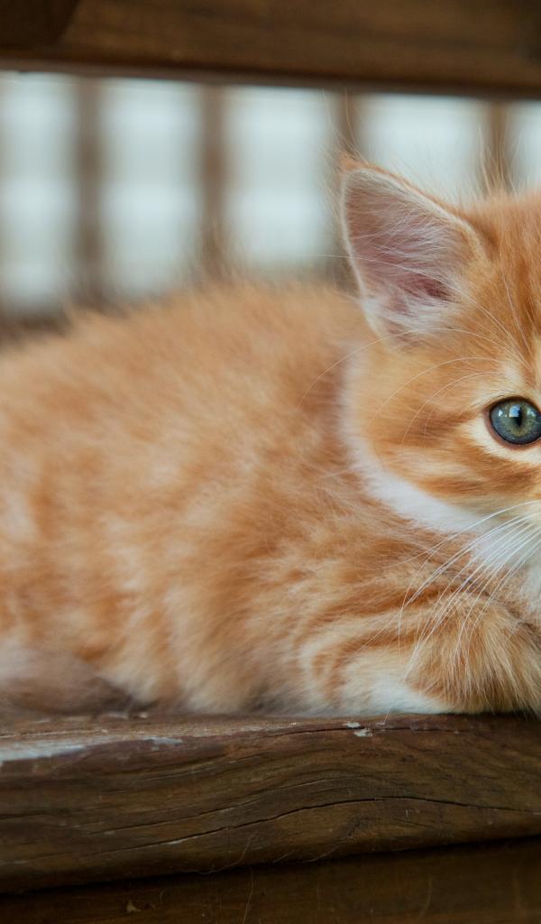 Wallpaper Little red kitten with blue eyes is lying on the bench