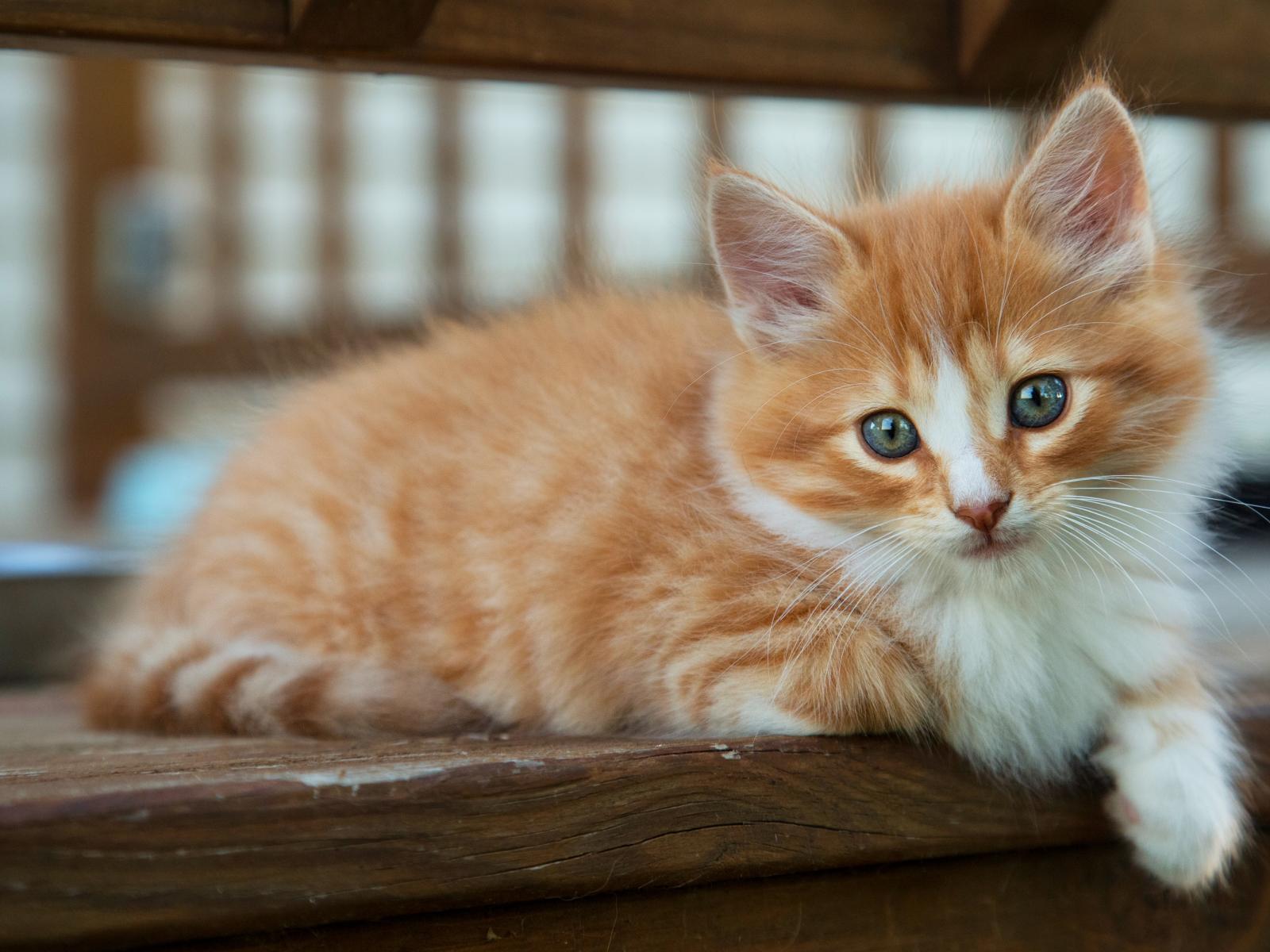Wallpaper Little red kitten with blue eyes is lying on the bench