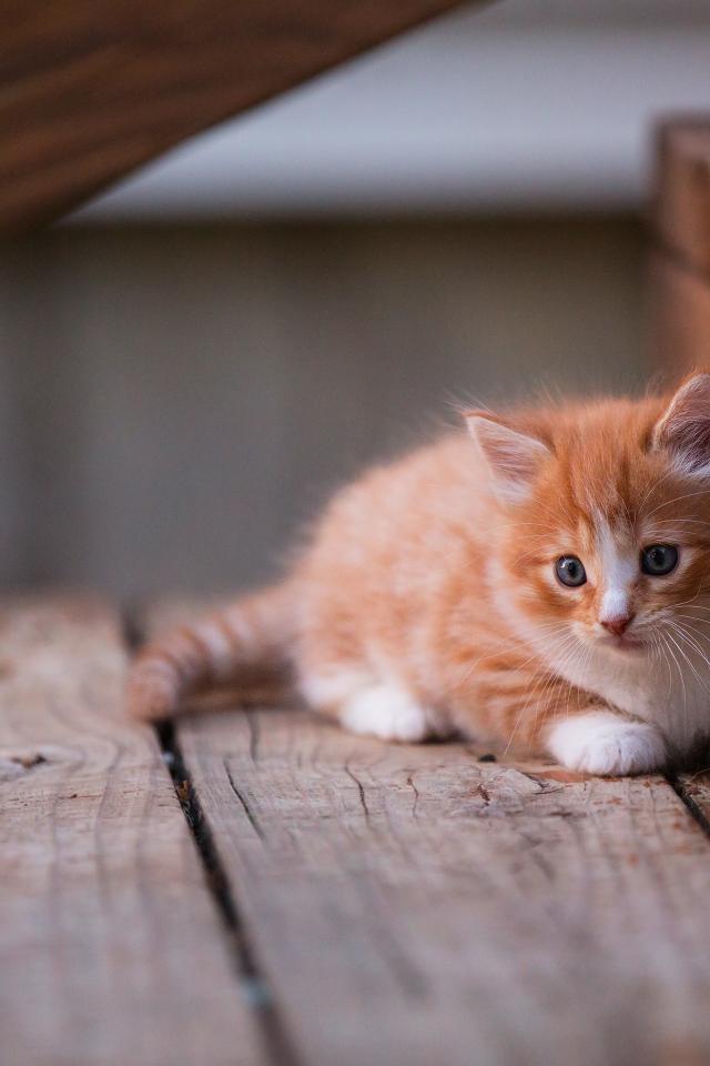 Wallpaper Little beautiful red kitten on a wooden threshold
