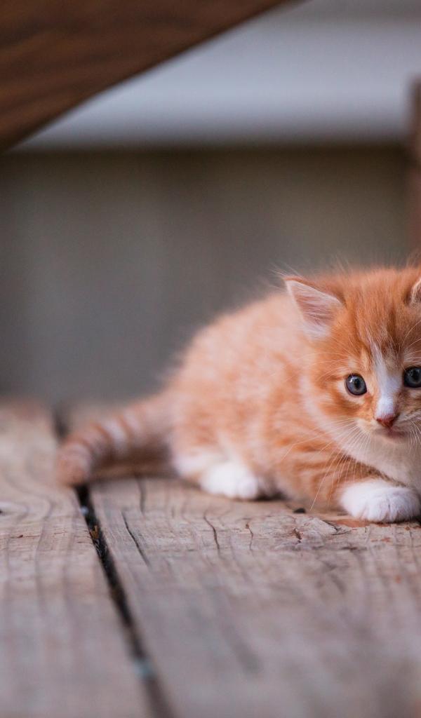 Wallpaper Little beautiful red kitten on a wooden threshold