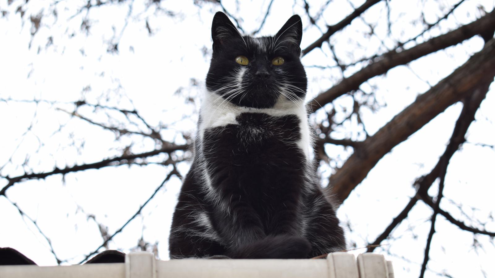 Wallpaper Big black and white cat sitting on the fence