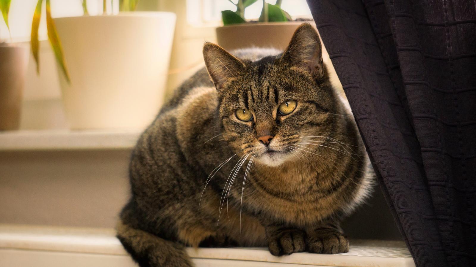 Wallpaper A beautiful gray cat sits on the battery by the window.