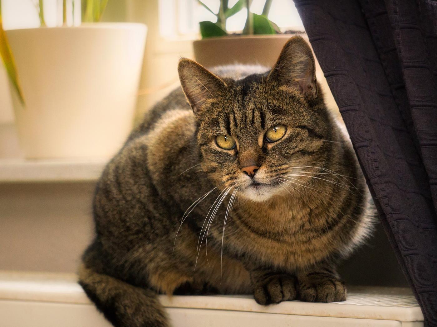 Wallpaper A beautiful gray cat sits on the battery by the window.