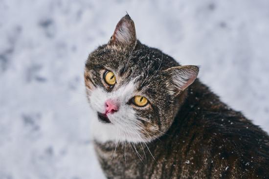 Wallpaper A beautiful gray cat with yellow eyes walks on the stones