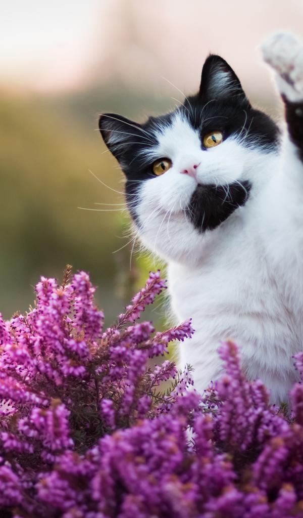Wallpaper Beautiful black and white cat sitting in pink colors