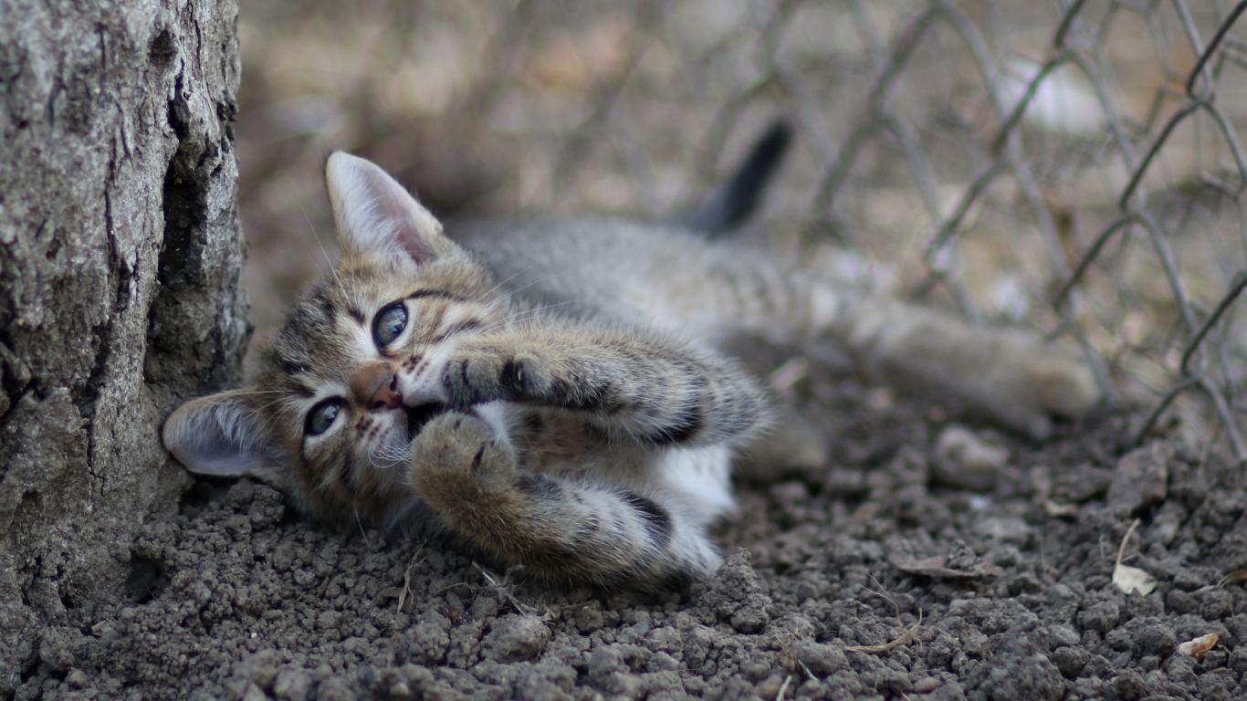 Wallpaper Little gray kitten playing by a tree on the ground.
