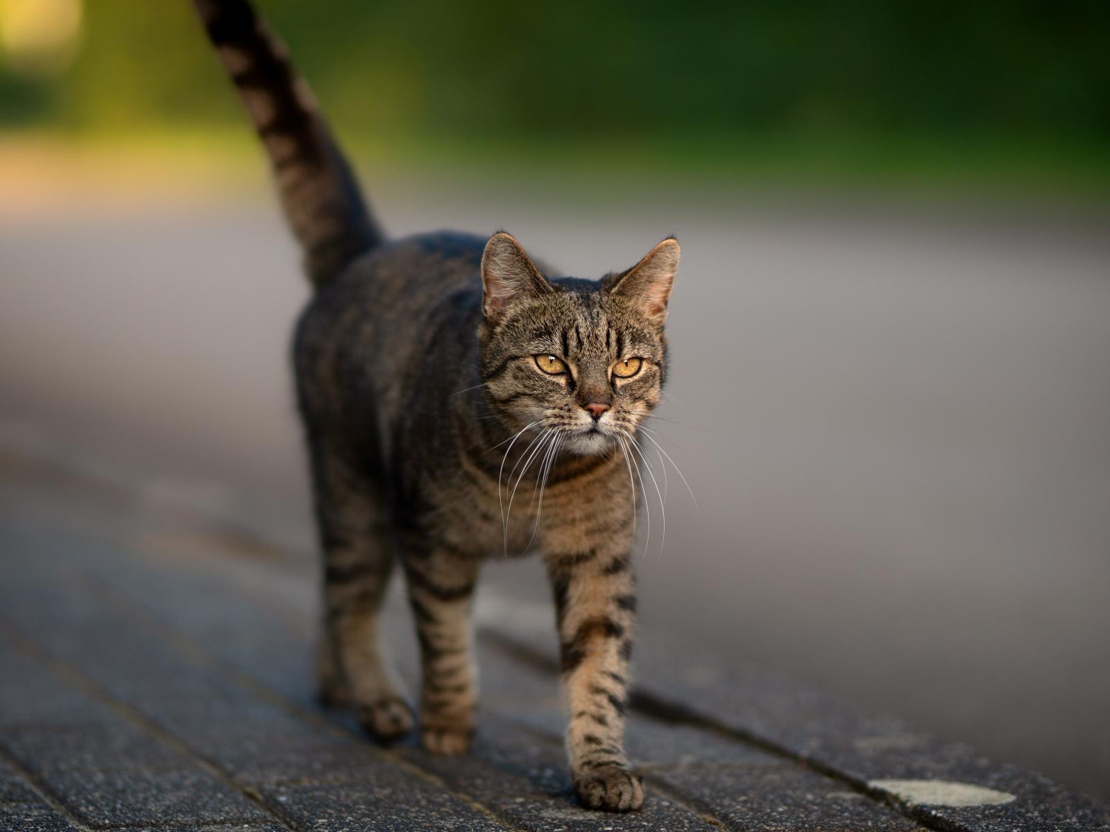 Wallpaper Gray cat with yellow eyes goes on the road