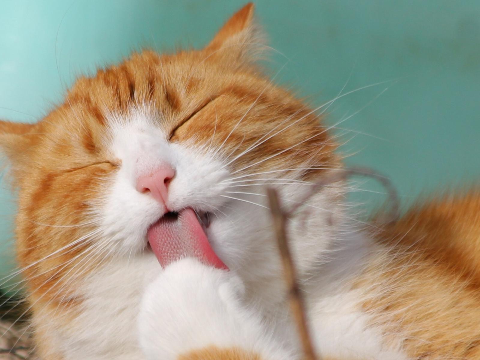 Wallpaper Red and white cat licks paw