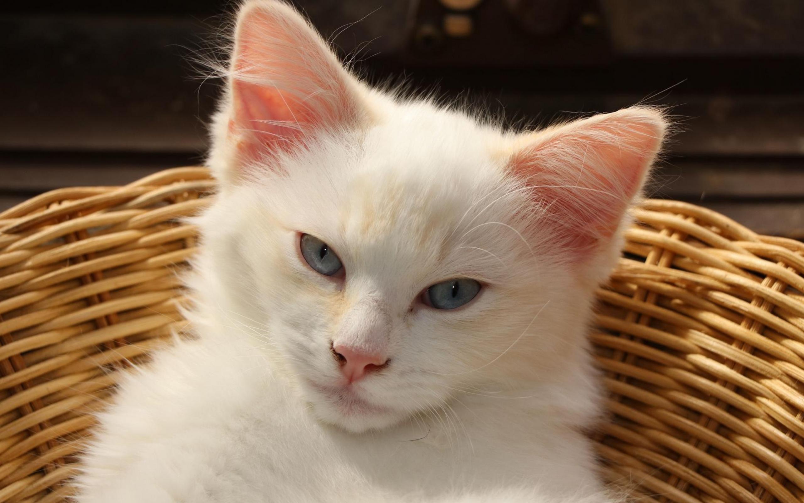 Wallpaper White blue-eyed kitten lies in a wicker basket