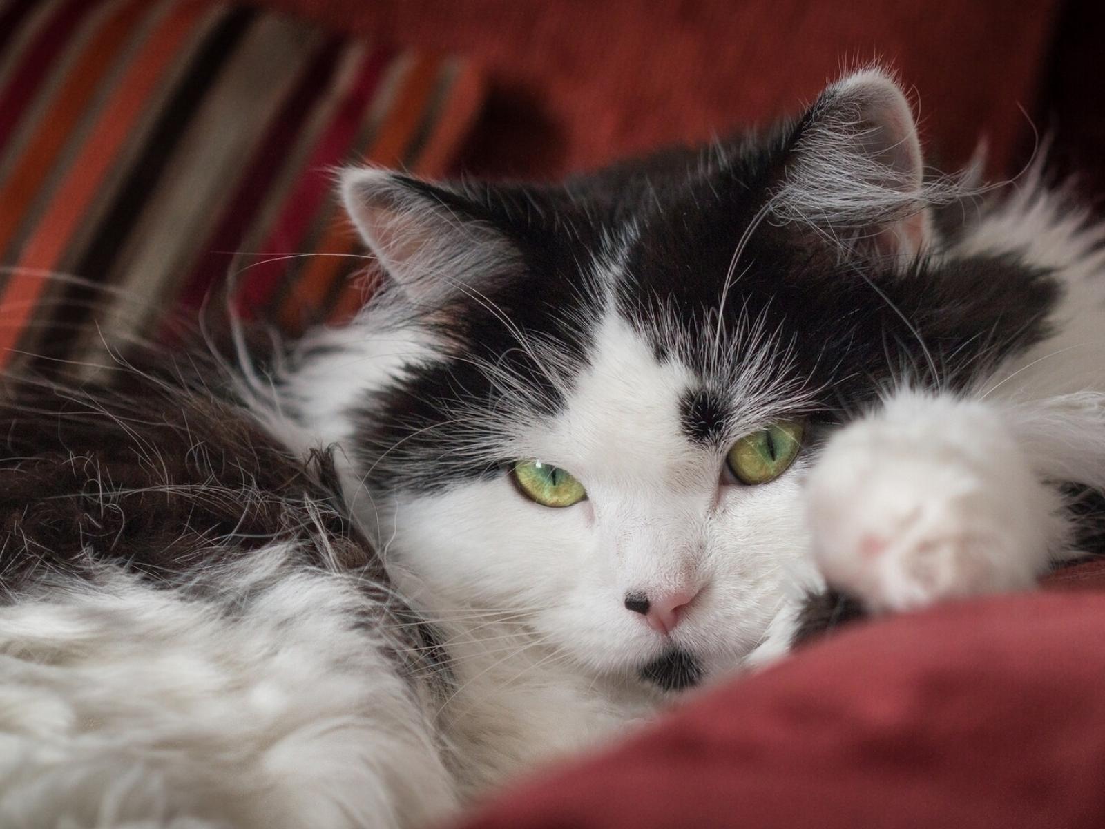 Wallpaper Beautiful fluffy black and white cat is lying on the sofa