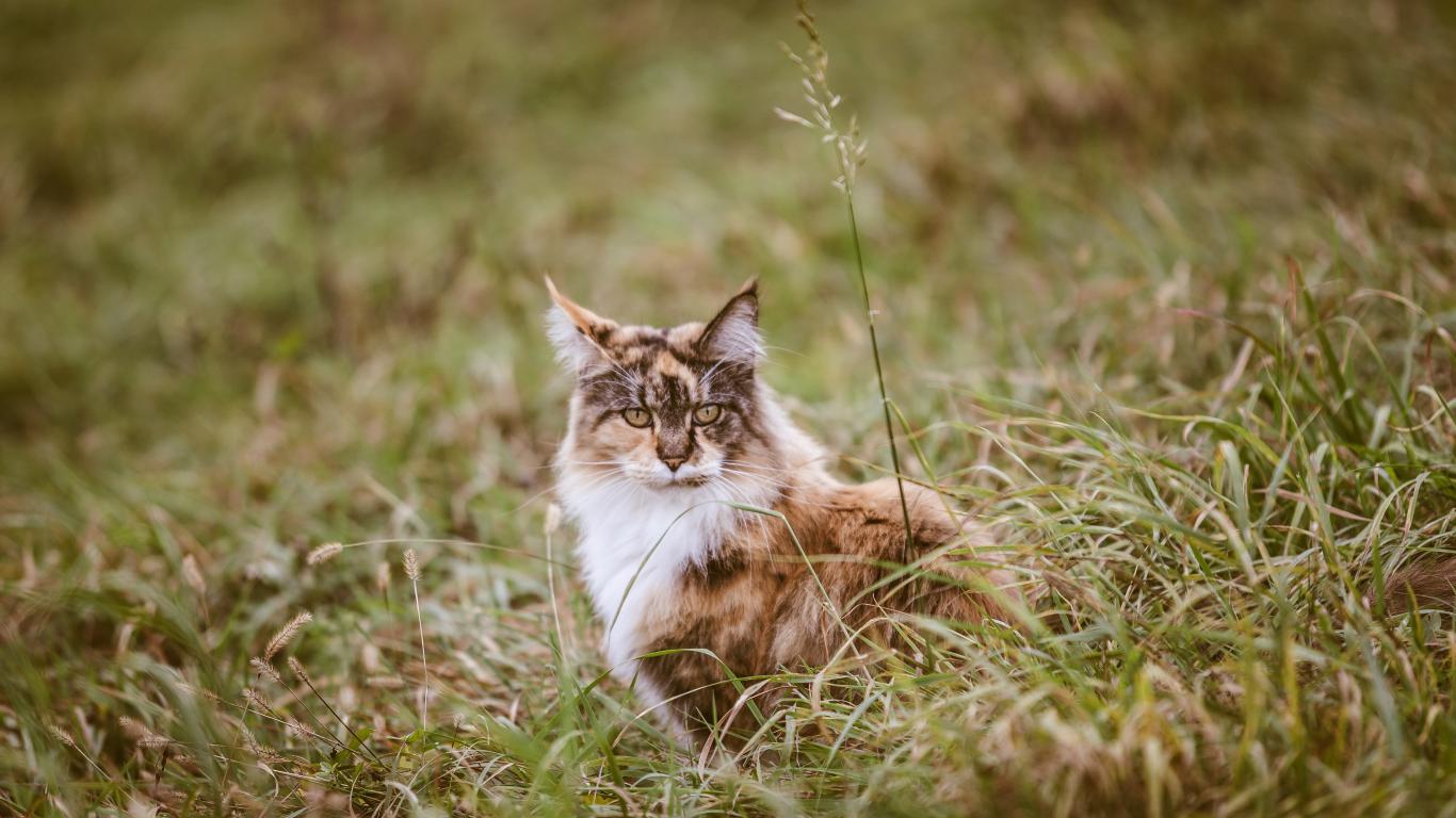 Wallpaper Beautiful tricolor cat sitting in the green grass