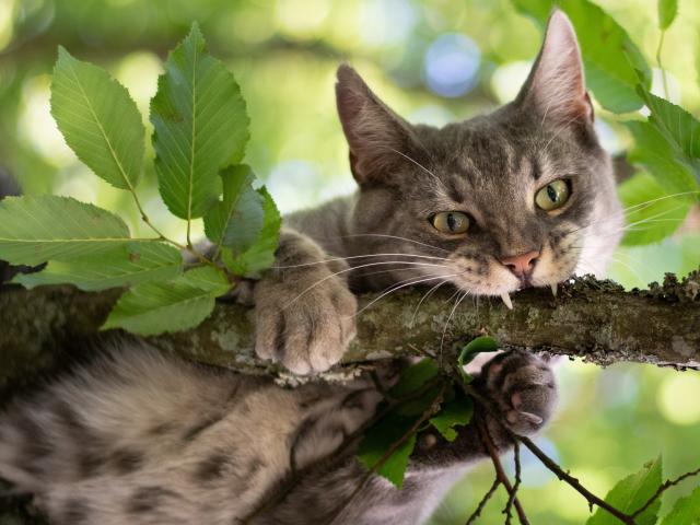 Wallpaper Squirrel nibbles a cone on the green branch of spruce