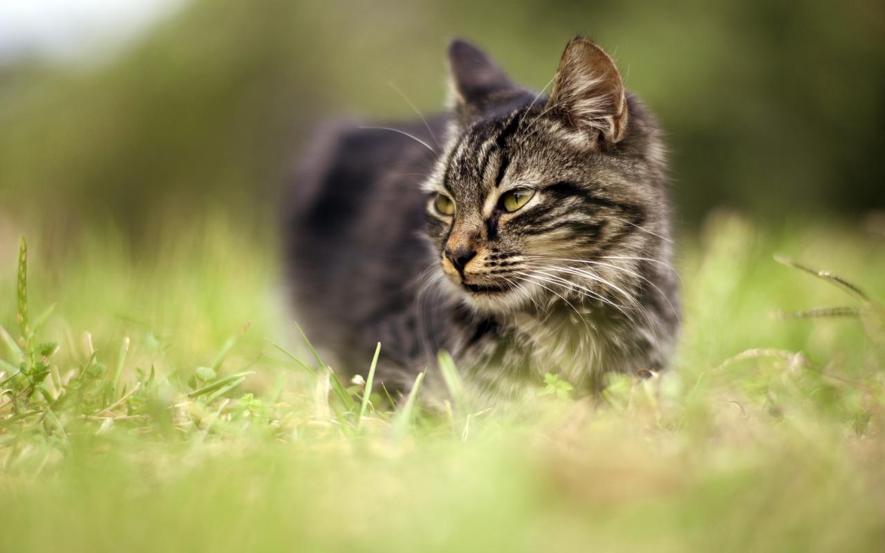 Wallpaper Gray cat walking on the green grass