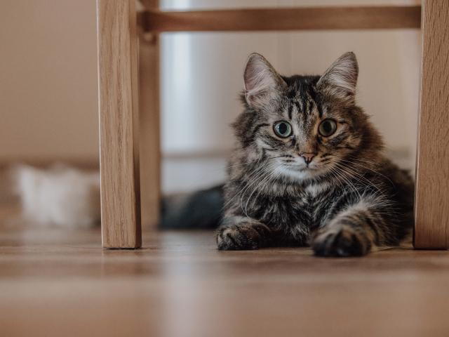 Wallpaper Gray fluffy cat with green eyes lying under the bench