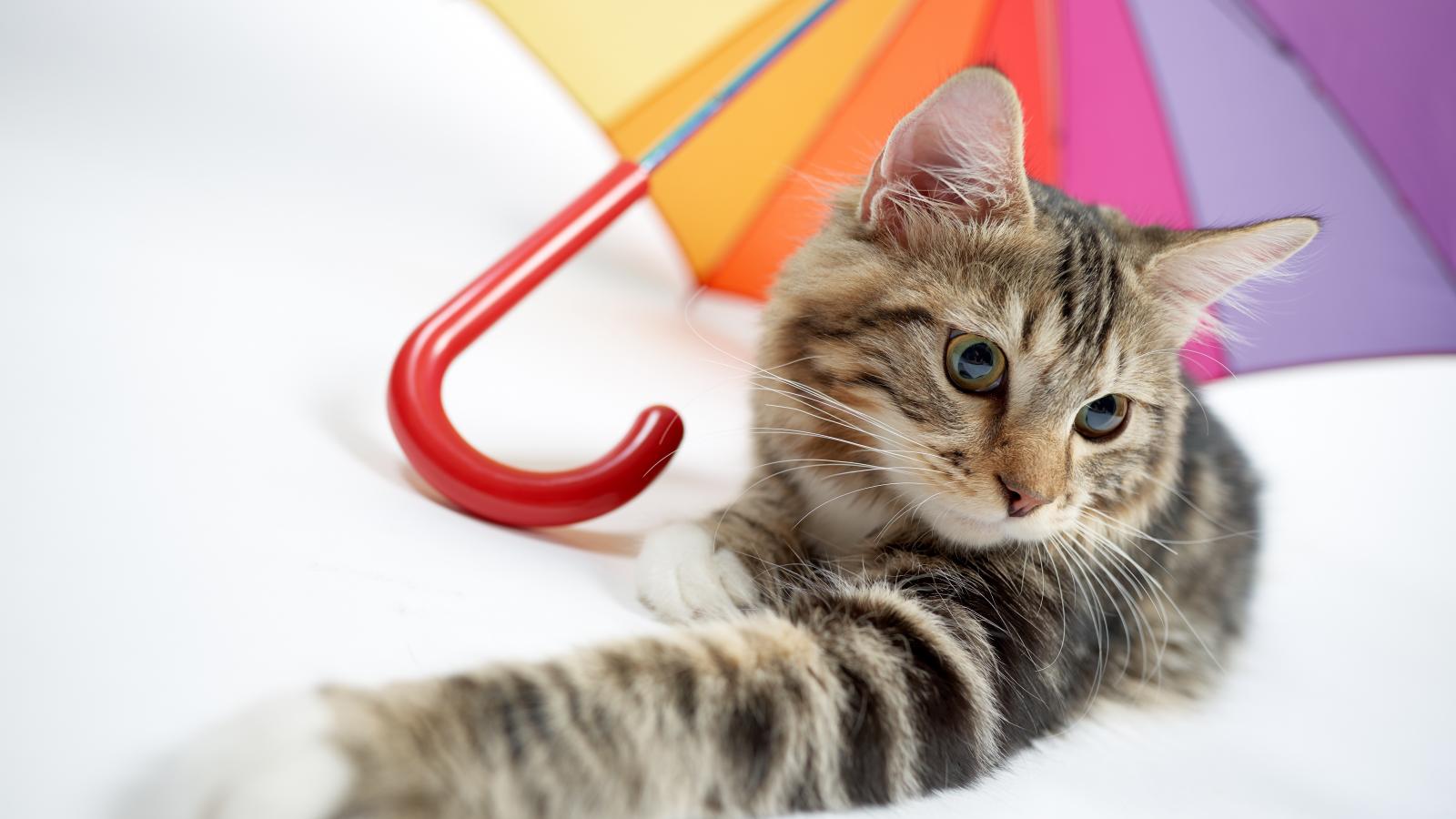 Wallpaper Gray cat lies under a multi-colored umbrella
