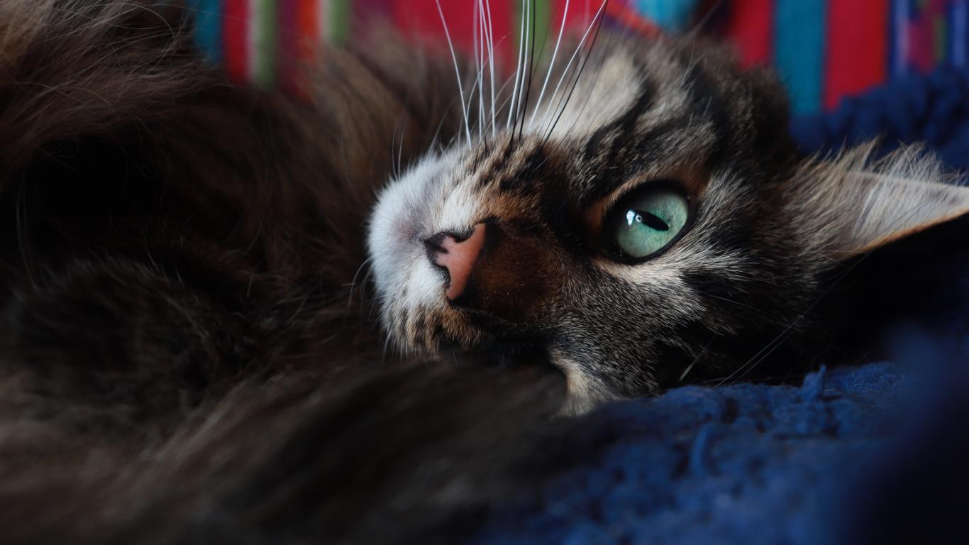 Wallpaper Beautiful gray cat with green eyes lying on the bed.