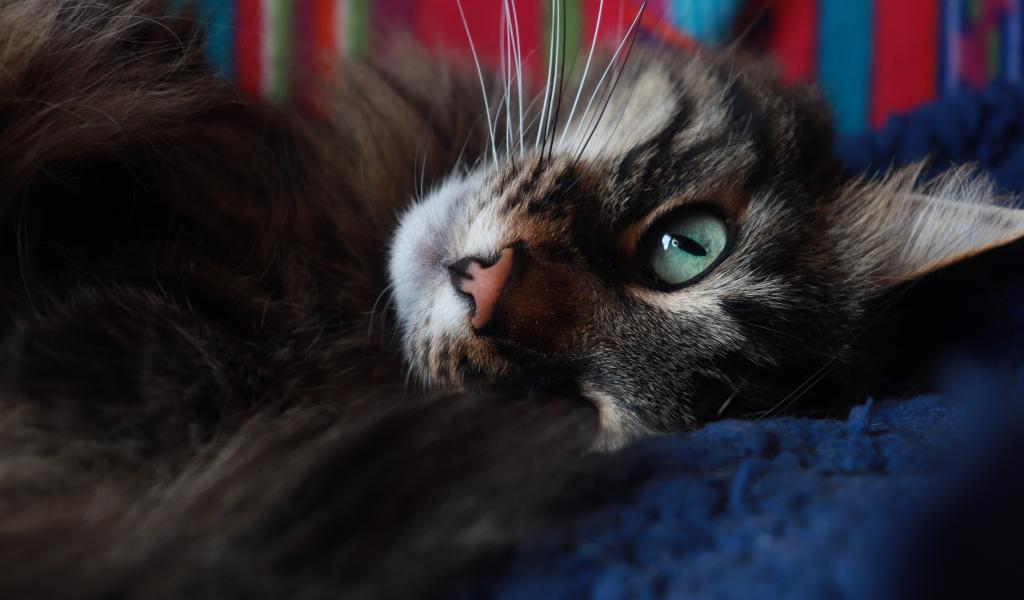 Wallpaper Beautiful gray cat with green eyes lying on the bed.