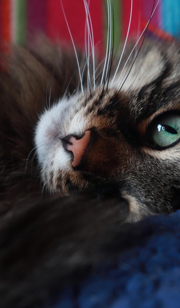 Wallpaper Beautiful gray cat with green eyes lying on the bed.