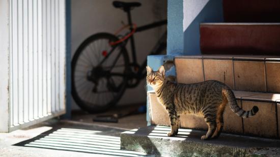 Wallpaper Curious gray cat stands on the steps