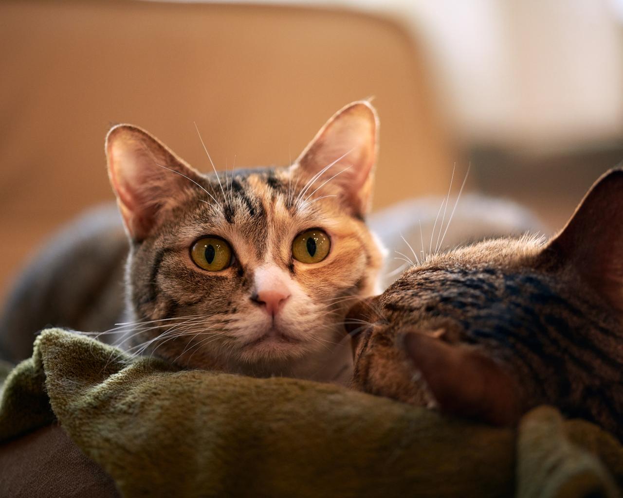 » Wallpaper Two gray cats are lying on the bed.