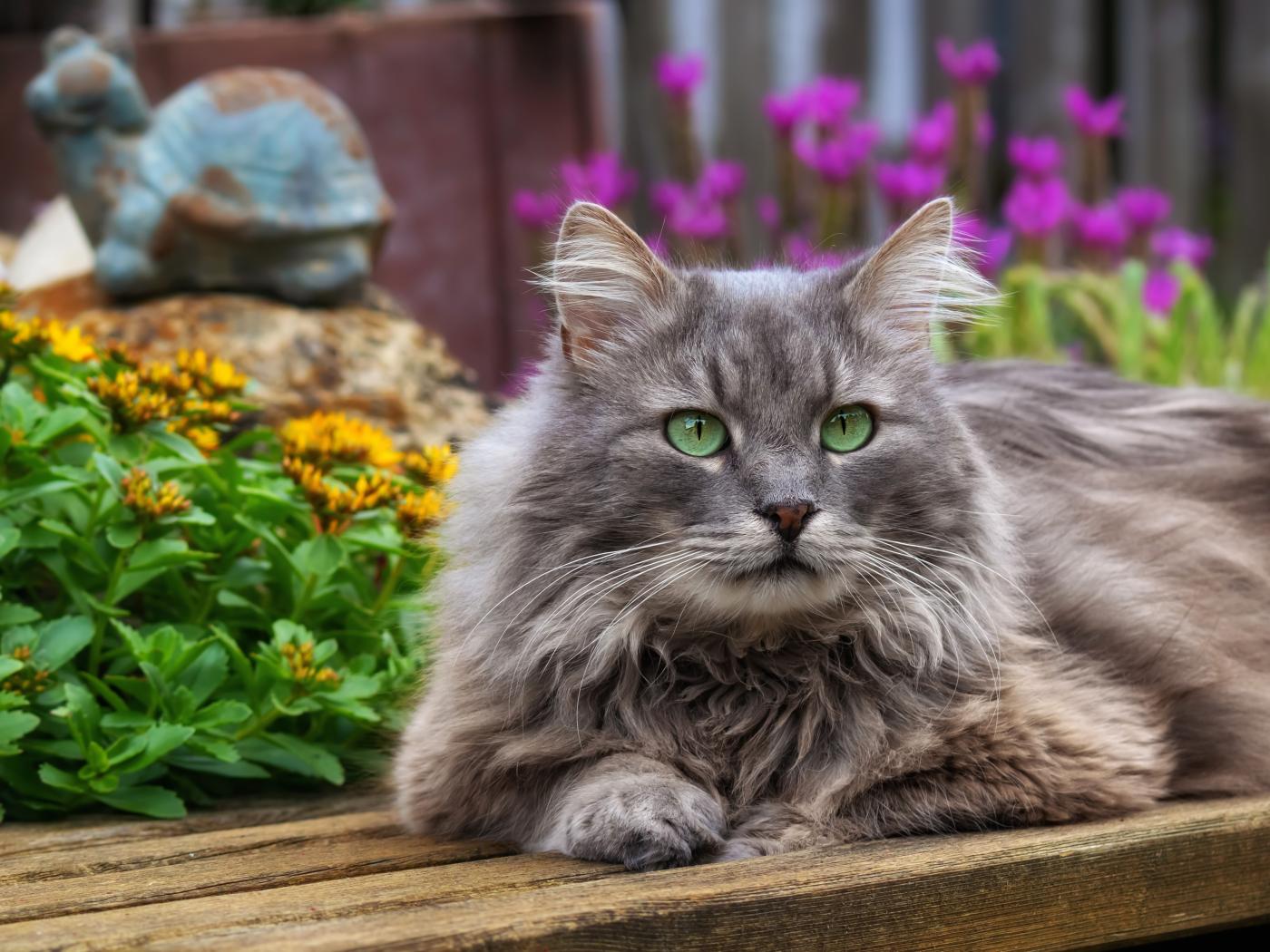 Wallpaper Beautiful green-eyed cat lies on a wooden bench