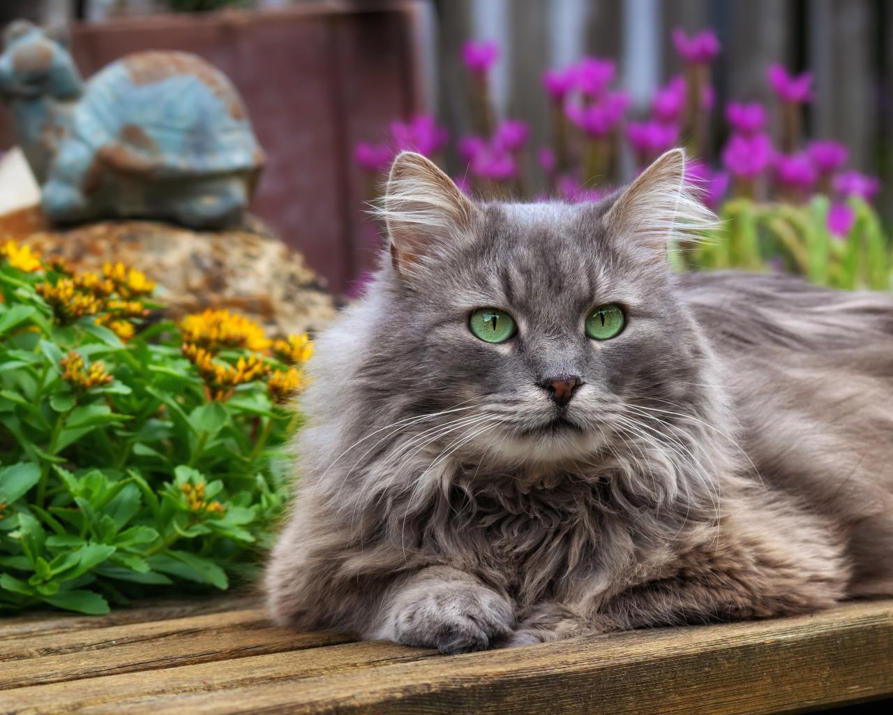Wallpaper Beautiful green-eyed cat lies on a wooden bench