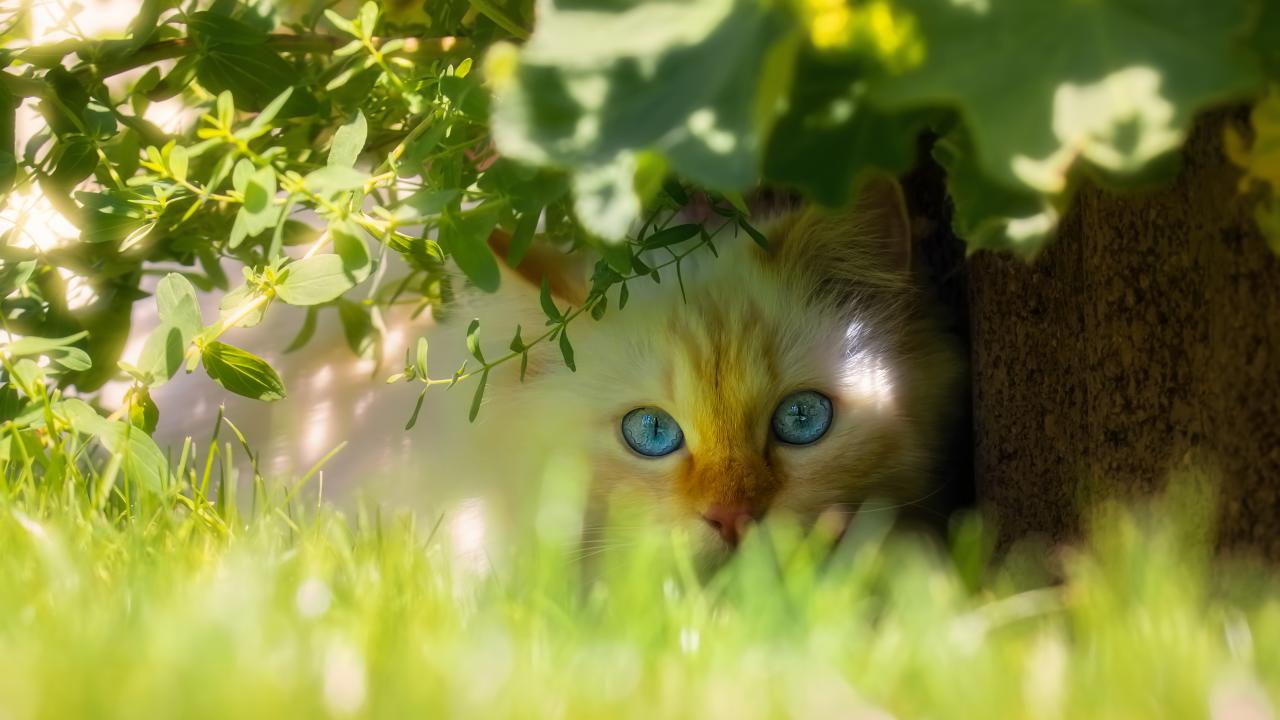 Wallpaper Beautiful blue-eyed cat is sitting in the green grass.