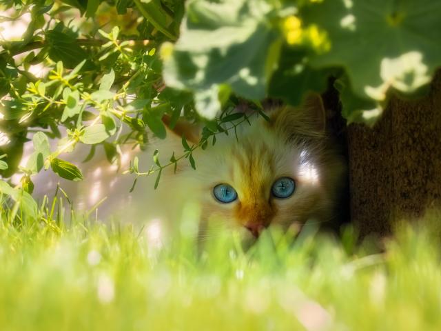 Wallpaper Beautiful blue-eyed cat is sitting in the green grass.