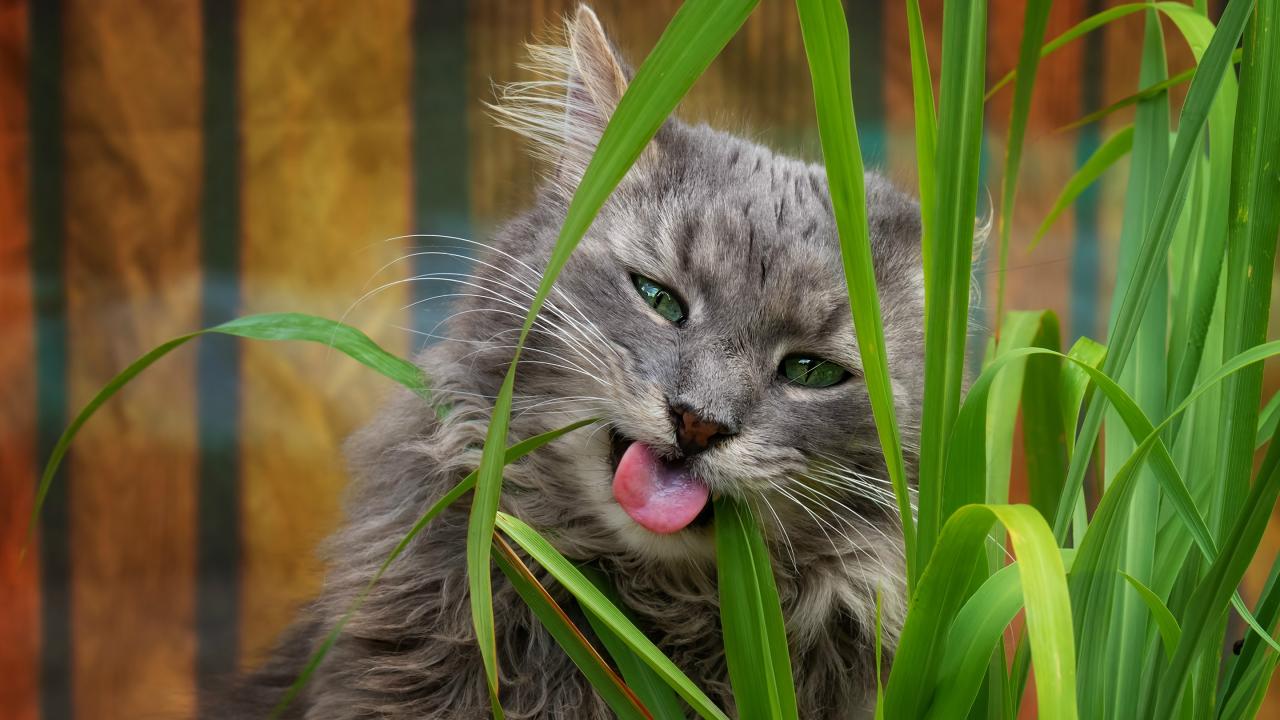 Wallpaper Gray green-eyed cat eats grass