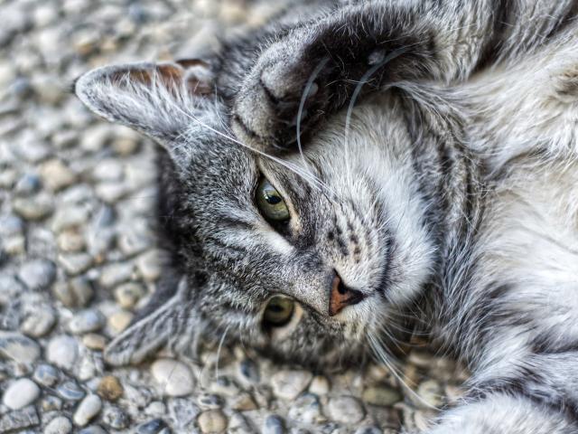 Wallpaper Gray cat lies on the pavement with its paws up