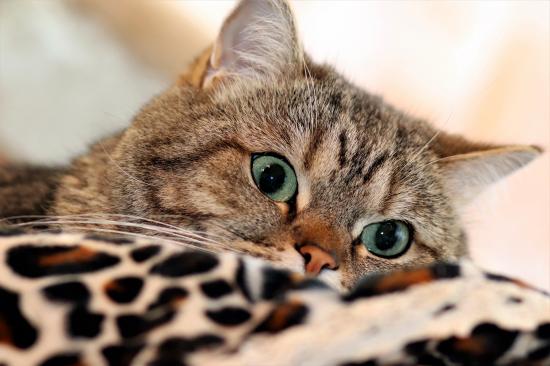 Wallpaper Beautiful gray purebred cat with green eyes lies on the bed
