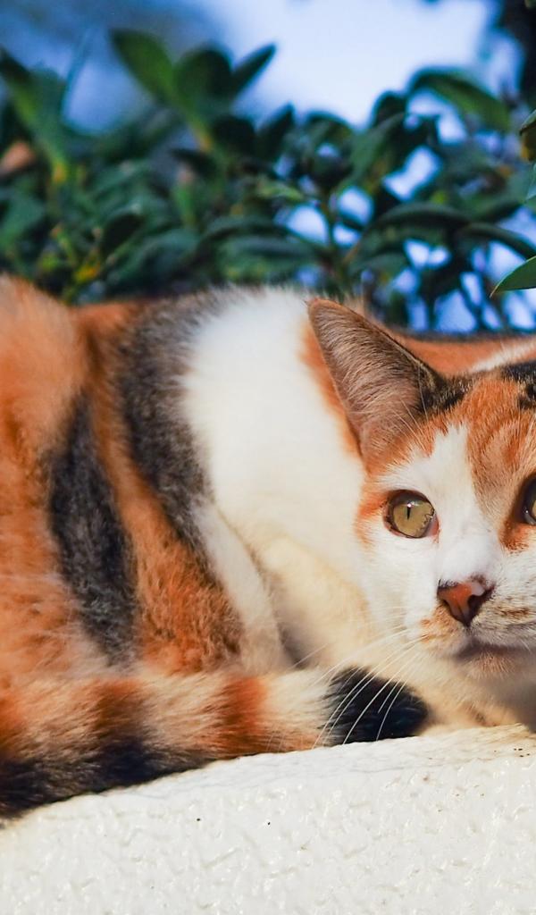 Wallpaper Tricolor cat basks in the sun