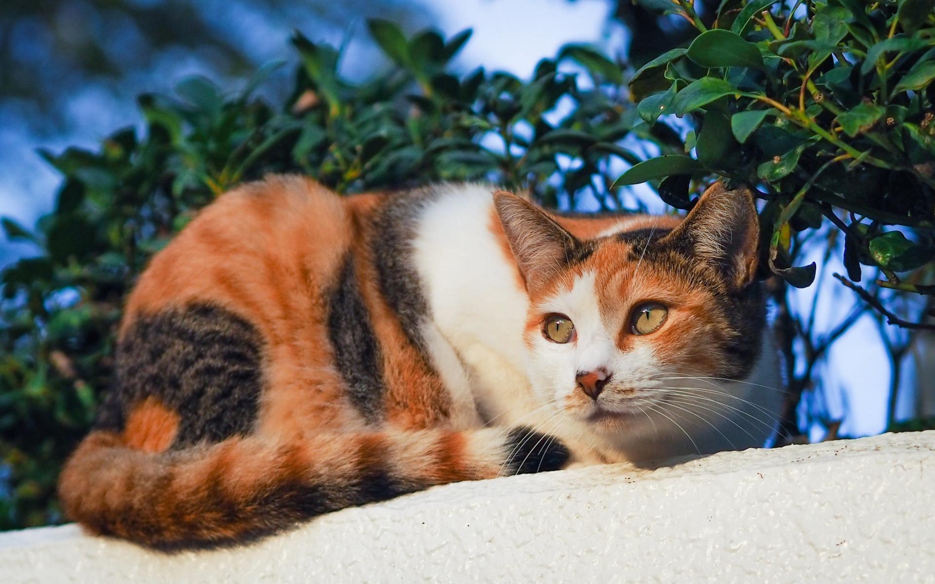 Wallpaper Tricolor cat basks in the sun