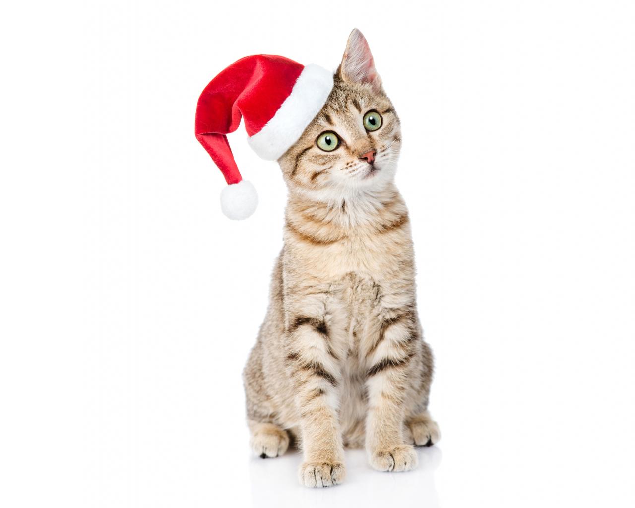 Wallpaper Gray cat in santa hat on white background
